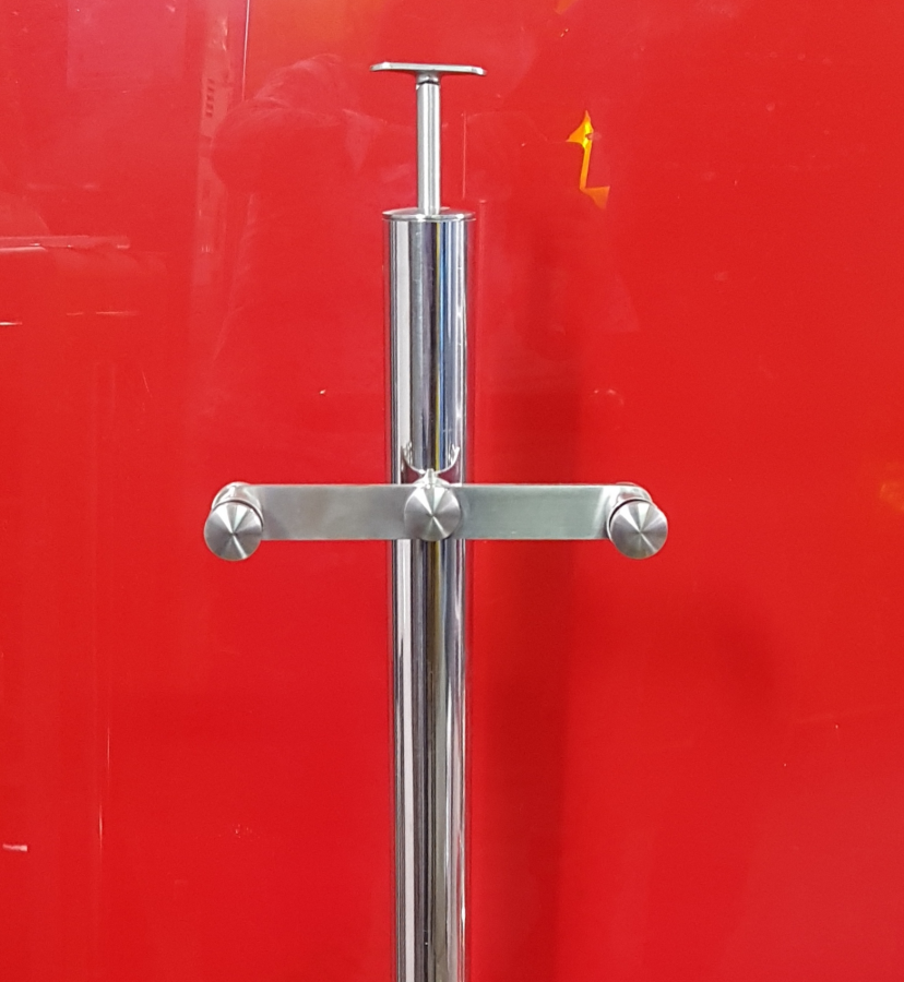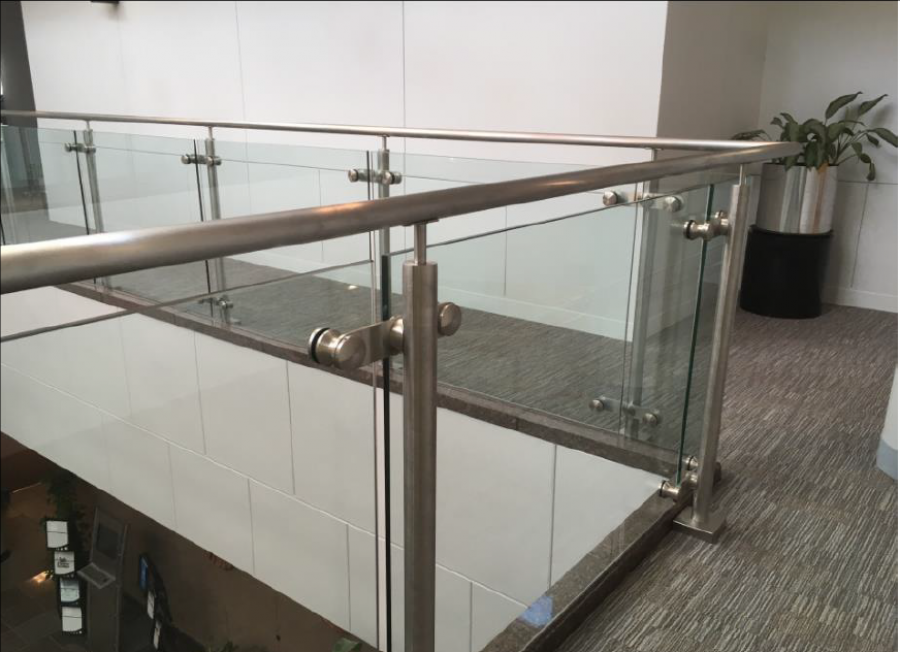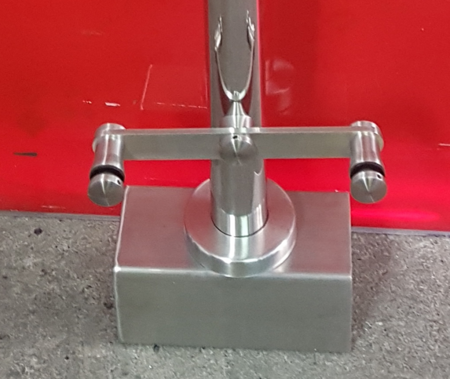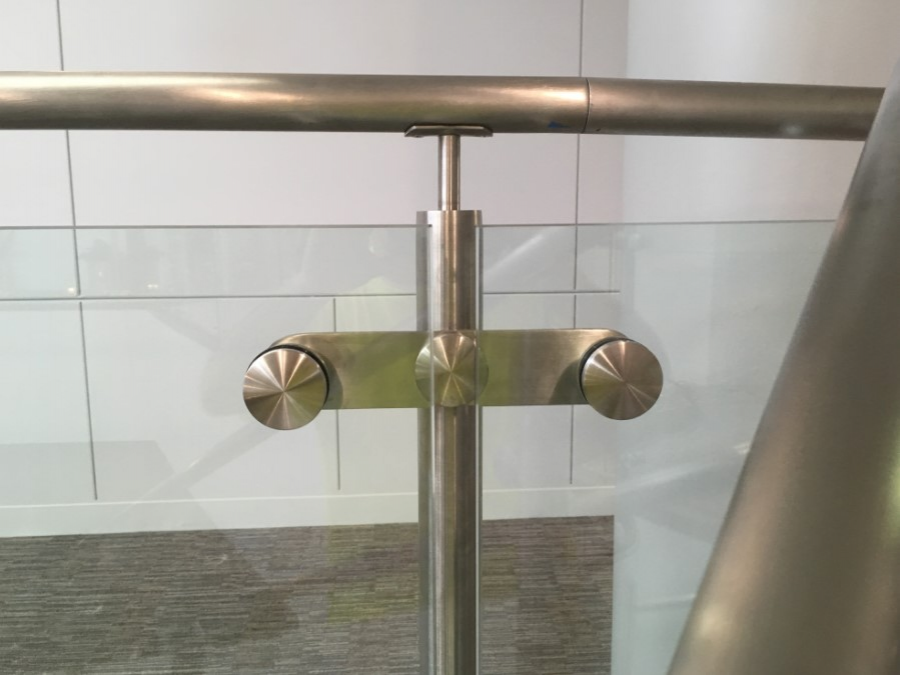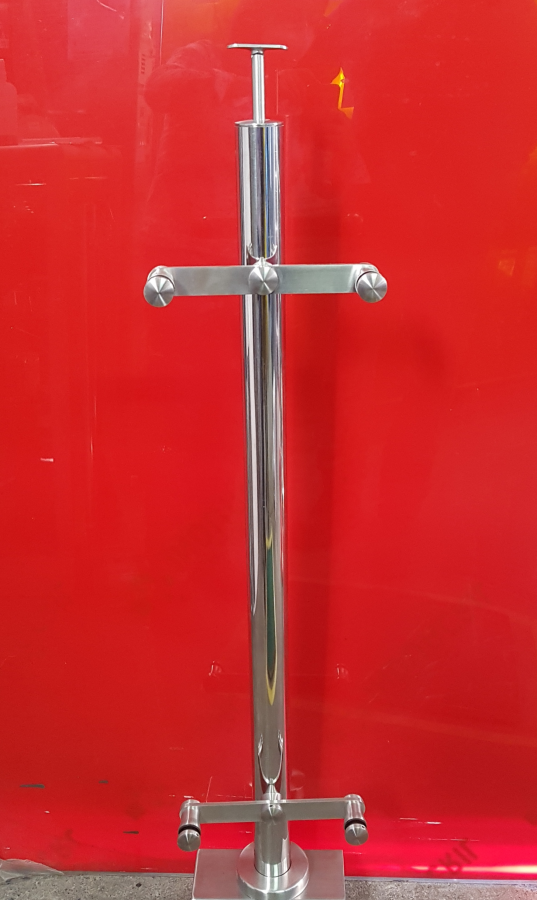 FABRICADO EN TUBO DE 2"X1.5 MM, DOS HERRAJES ALARES DOBLES, BASE SOLDABLE CON TAPA, ESPIGA ARTICULADA PARA SOPORTAR PASAMANOS. CRISTAL DEBE SER PERFORADO,